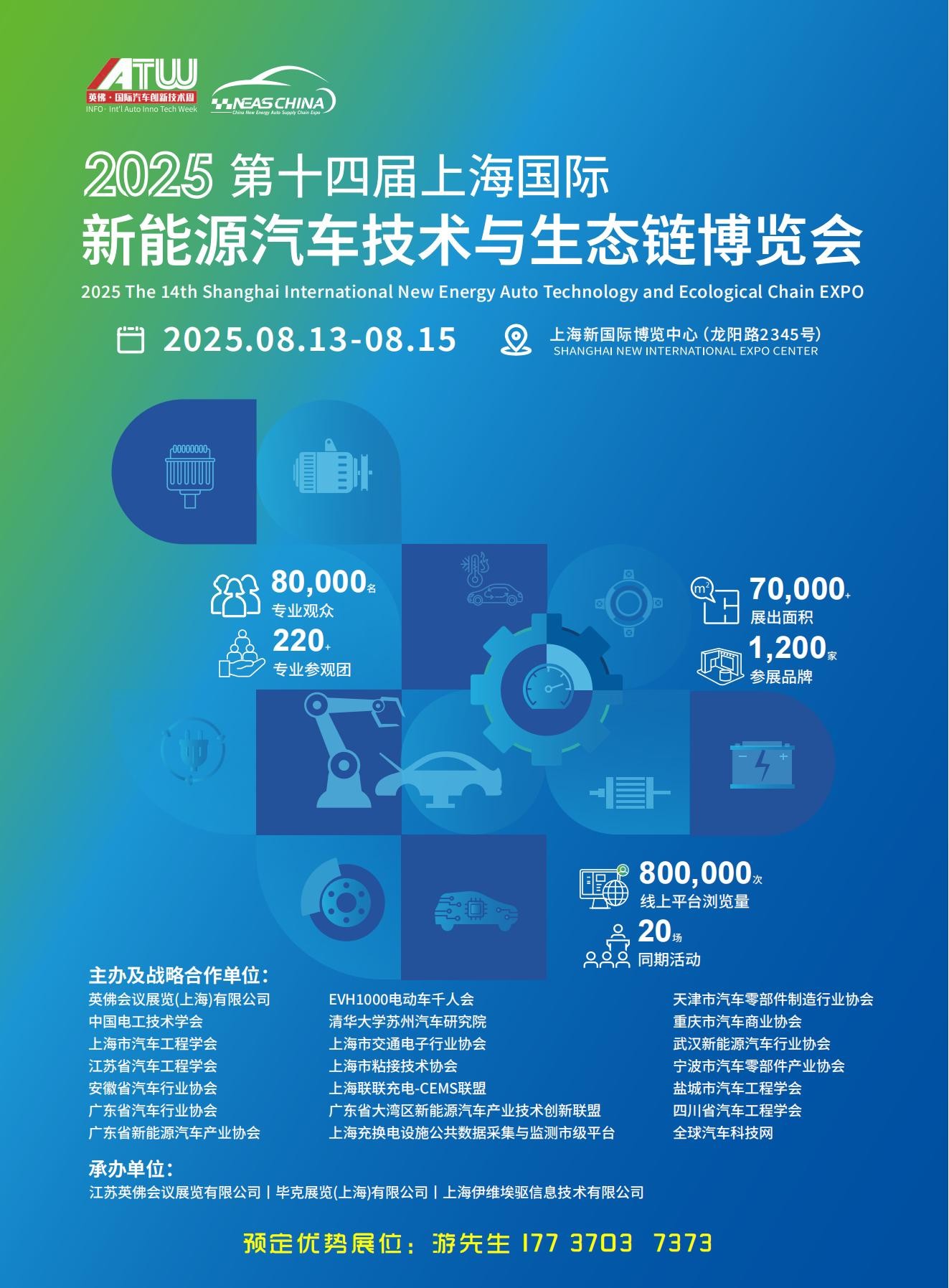 第十四届上海国际新能源汽车技术与生态链博览会 展会基本信息:展会时间:2025年8月13日-15日展会地点:上海新国际博览中心(浦东)展出面积:70,000平方米参展品牌:1200+观众数量:专业观众将超80,000名,220+专业买家团来自全球50多个国家和地区 组织机构:主办及战略合作:…