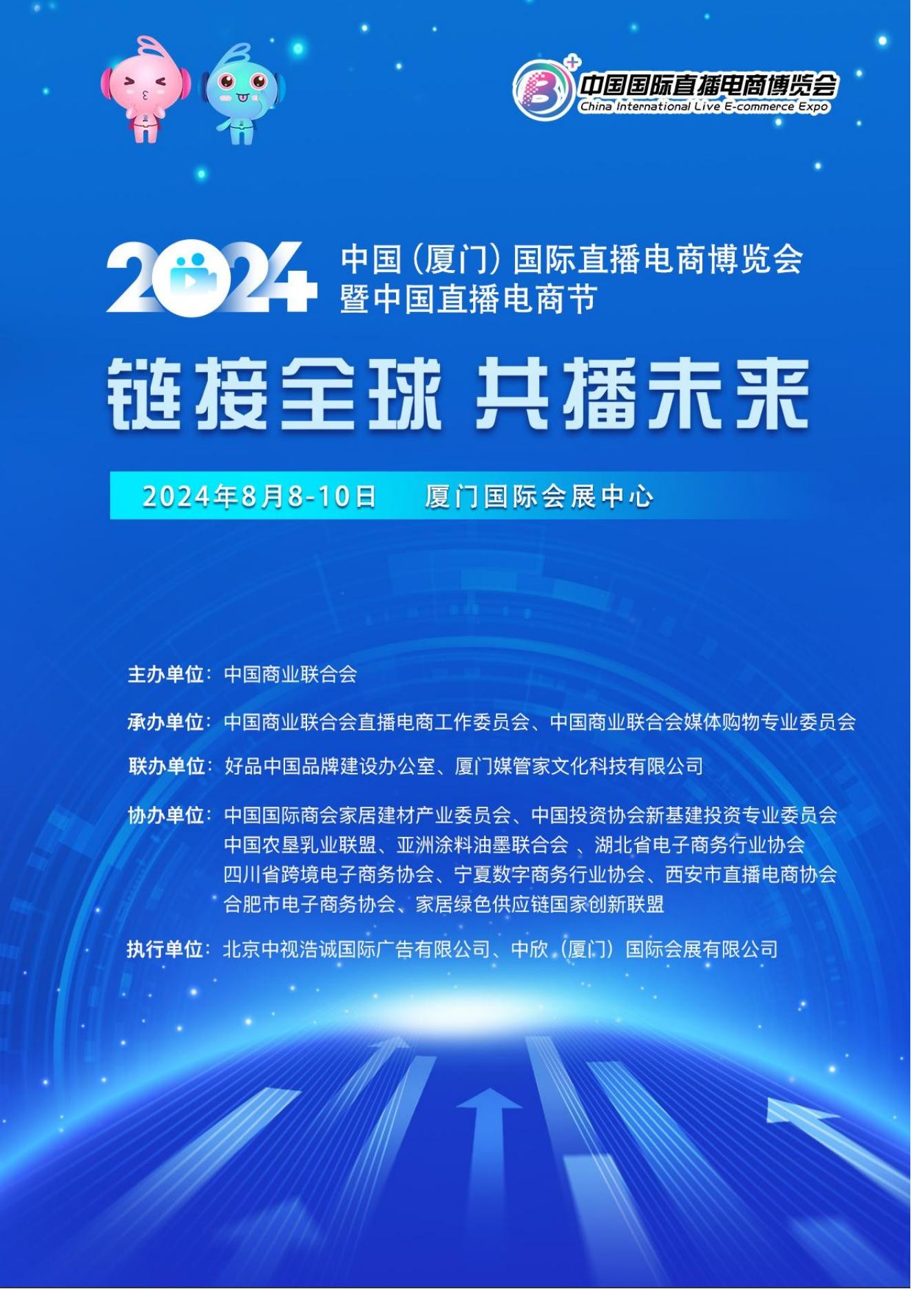“链接全球 共播未来”2024暨中国直播电商节中国(厦门)国际直播电商博览会2024年8月8-10日 厦门国际会展中心 主办单位:中国商业联合会承办单位:中国商业联合会直播电商工作委员会、中国商业联合会媒体购物专业委员会联办单位:好品中国品牌建设办公室、厦门媒管家文化科技有…