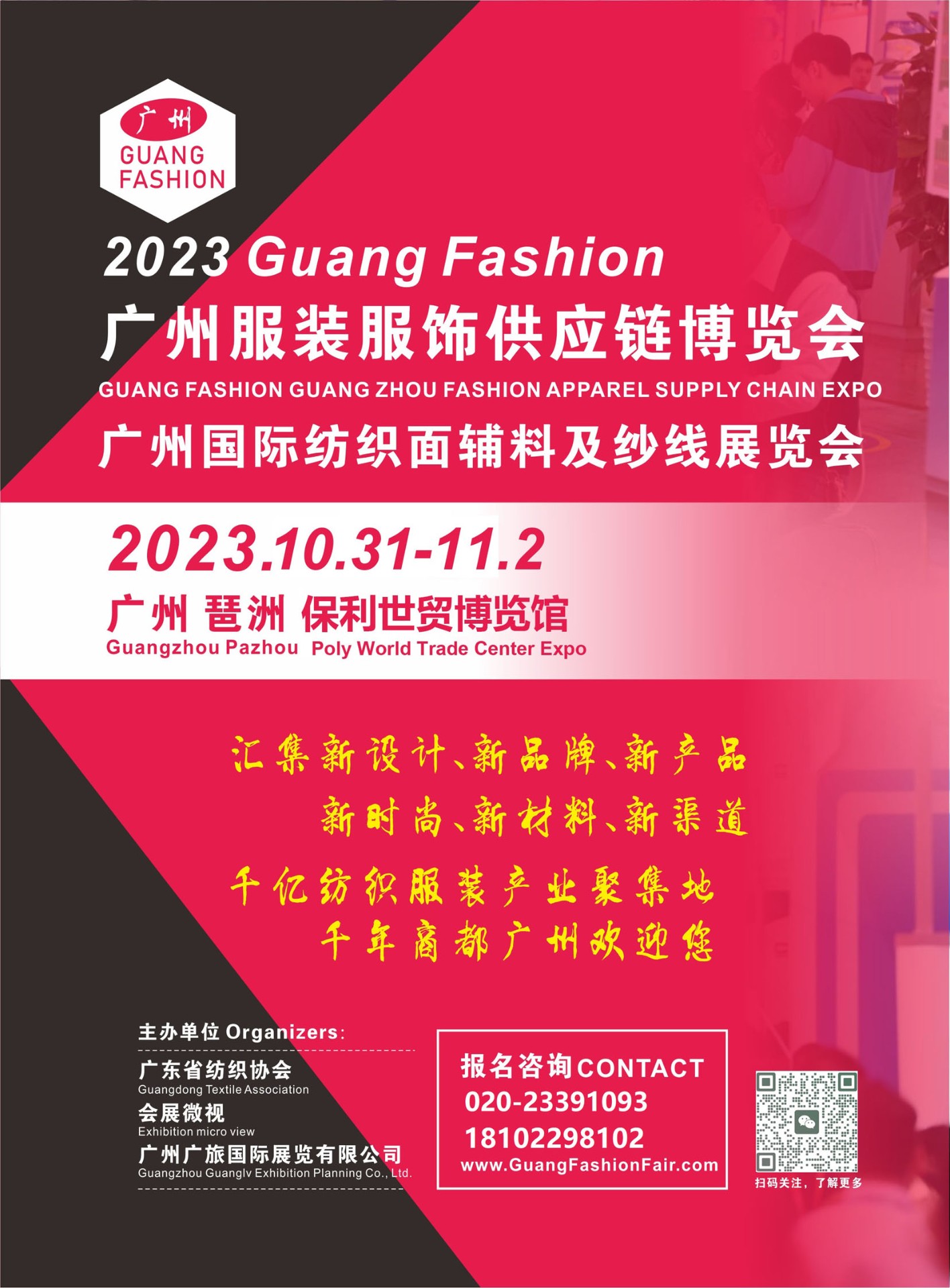 2023广州国际服装服饰供应链博览会2023国际纺织面料辅料及纱线(广州)展览会Guang Dong Fashion Apparel Supply Chain Expo 基本信息时间:2023年10月31-11月2日地点:广州 琶洲 保利世贸展馆展商数量:500家 展会规模:30,000平方米参观观众:30,000专业观众展会主题:汇集新…