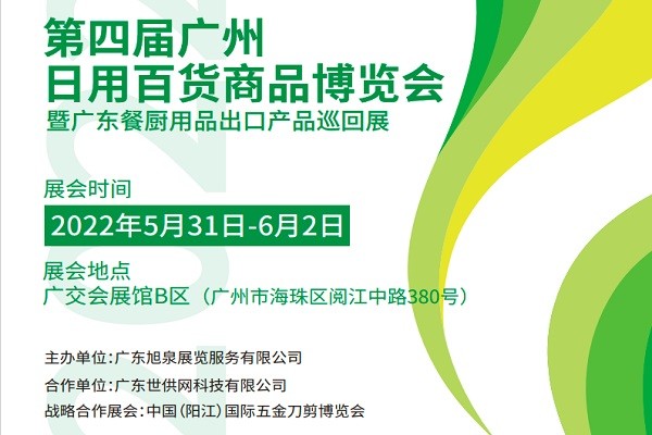 2022第4届广州日用百货商品博览会暨广东餐厨用品出口产品巡回展展会时间:2022年5月31日-6月2日展会地点:中国进出口商品交易会展馆B区(广州市海珠区阅江中路380号)展会规模:4个展馆、35000+平方米、2000+展位、预计观众60000+人次主办单位:广东旭泉展览服务有限公司合作单…