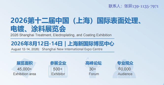 2026第十二届中国(上海)国际表面处理、电镀、涂料展览会2026 Shanghai Treatment, Electroplating, and Coating Exhibition2026年8月12日-14日 | 上海新国际博览中心August 12-14, 2026| Shanghai New International Expo Centre展会规模:展览4.5万平米、展商500余家、观…