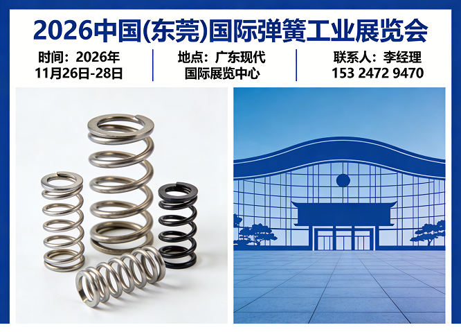 2026中国(东莞)国际弹簧工业展览会时 间:2026年11月26日-28日 地 点:广东现代国际展览中心【前 言】弹簧是一种利用弹性来工作的机械零件,作为通用零部件,弹簧功能涵盖了减震、储能、控制、维持张力等诸多方面。弹簧的种类复杂多样,其应用领域涉及到国民经济各个领域。弹…