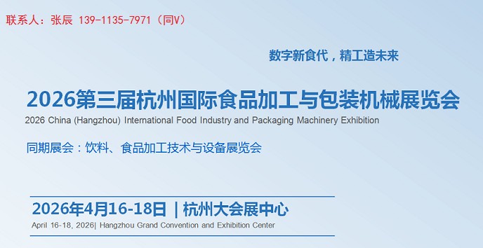 2026第三届杭州国际食品加工与包装机械展览会2026 China (Hangzhou) International Food Industry and Packaging Machinery Exhibition同期展会:饮料、食品加工技术与设备展览会2026年4月16-18日 | 杭州大会展中心承办单位北京江恒博威国际展览有限公司 江恒博威(上海)会展…