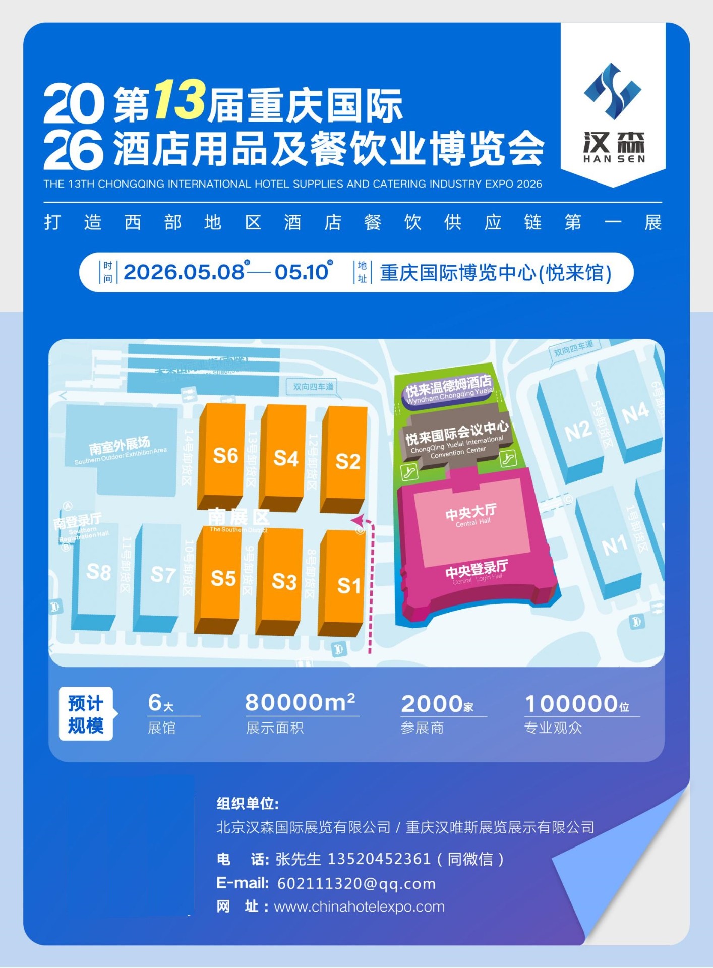 2026第13届重庆国际酒店用品及餐饮业博览会2026年5月8-10日中国重庆国际博览中心(悦来馆)展会规模3000+ 国际标准展位 80000 + ㎡ 80000 + 专业观众报名参展:张少桦 13520452361(同V) 承办单位北京汉森国际展览有限公司重庆汉唯斯展览展示有限公司 重庆国际酒店用品及餐饮…