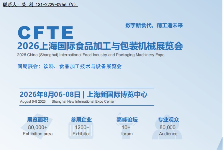 CFTE2026上海国际食品加工与包装机械展览会2026 China (Shanghai)International Food Industry and Packaging Machinery Expo同期展会:饮料、食品加工技术与设备展览会2026年8月06-08日 |上海新国际博览中心承办单位北京江恒博威国际展览有限公司 江恒博威(上海)会展有限公司…