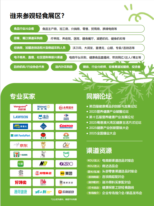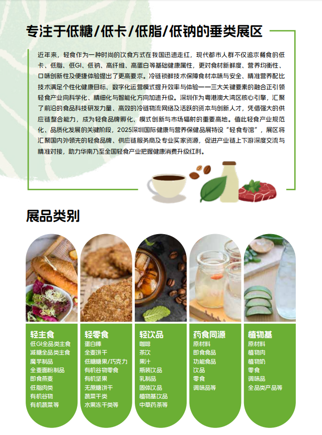 展示面积250,000平米,参展企业2,500+家,海内外专业实家150,000 与健康天然原料展、食品及加工包装展、酒店餐饮展、烘焙展、乐本生活方式展同期举办,共享深圳联展买家资源,从“优质天然源头直供-创新加工与保鲜技术- 成品研发与品牌孵化-健康生活融合创新-连锁拓展与渠道分销”,享一体化采购与供应平台 洞悉健康餐饮消费新需求(功能性轻食、便捷化、可持续理念),助力企业精准把握市场脉搏,抢占健康轻食万亿级市场增长先机