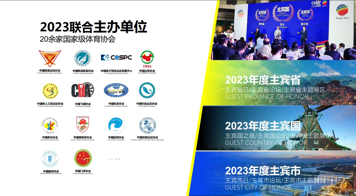 北京斯迈夫国际体育产业展CSMF Sports Expo由斯迈夫公司与中国极限运动协会、中国电子竞技运动发展中心、中国铁人三项协会、中国拳击协会等20余个体育协会联合主办,荷兰、贵州省、晋江市分别作为主宾国、主摈省、主宾市携当地体育产业优势资源,全力支持展览会的举办。