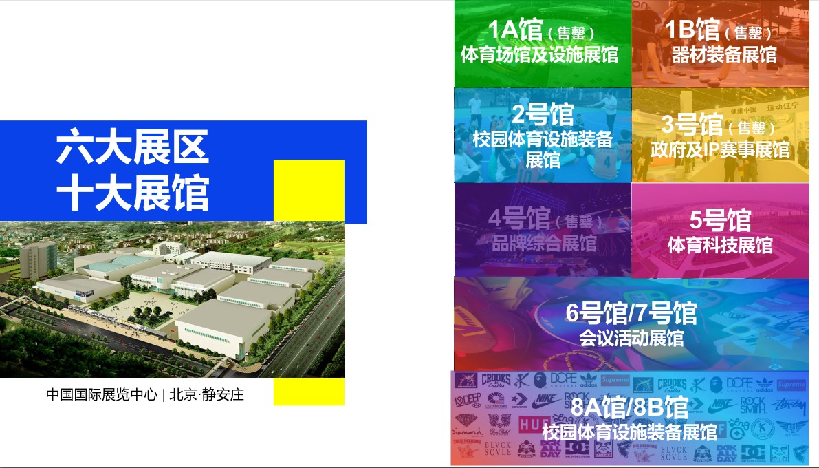 1、体育场馆及设施展区: 场馆设施/场馆系统/ 场馆设计运营服务/运动地板/草 坪/照明/泳池等