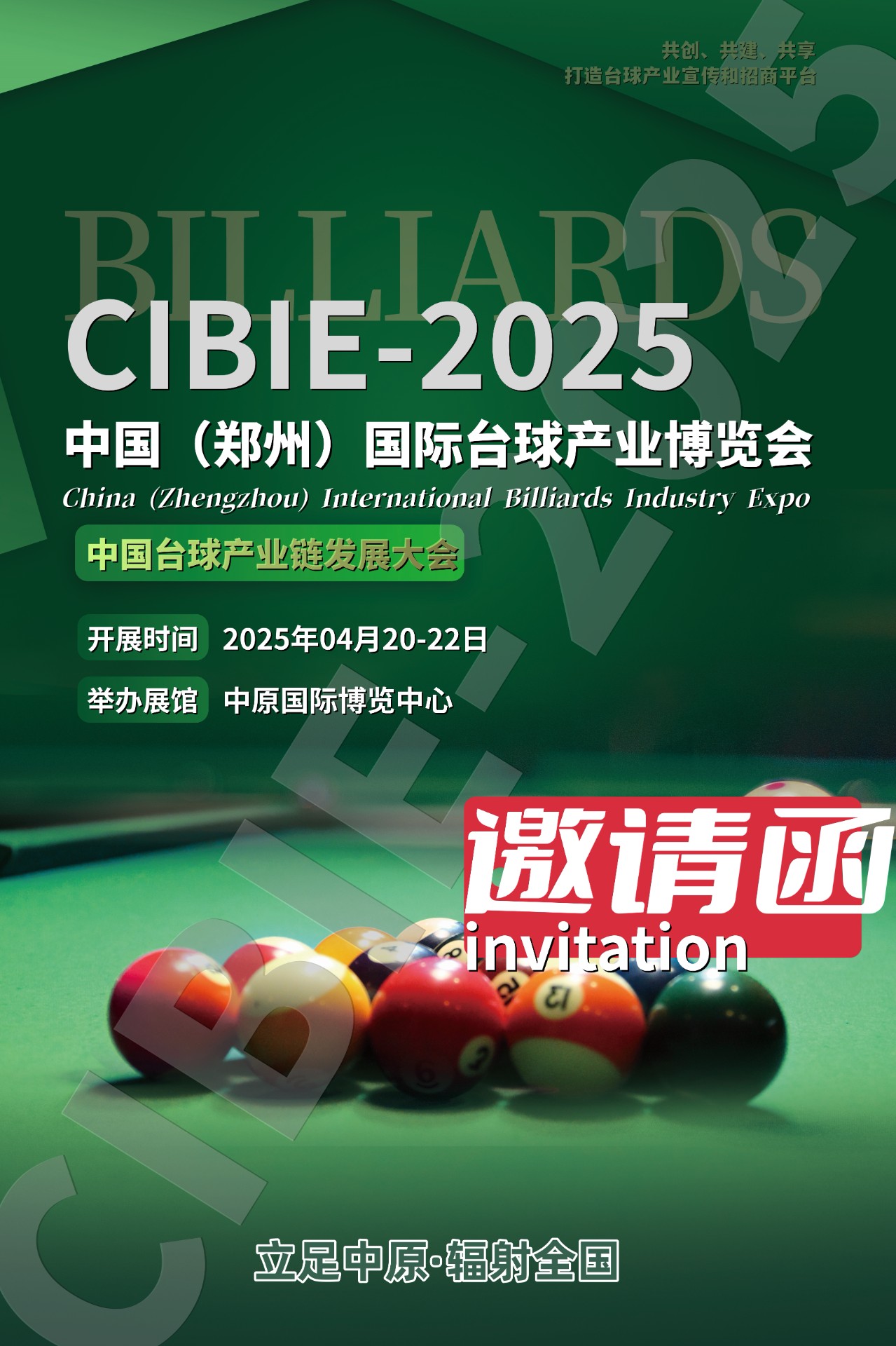 2025中国(郑州)国际台球产业博览会(CIBIE)The 2025 China (Zhengzhou) International Billiards Industry Expo时间:2025年04月20-22日|April 20-22, 2025.展馆:中原国际博览中心|Zhongyuan International Expo Center.主题:共创、共建、共享,打造台球产业宣传和招商平台