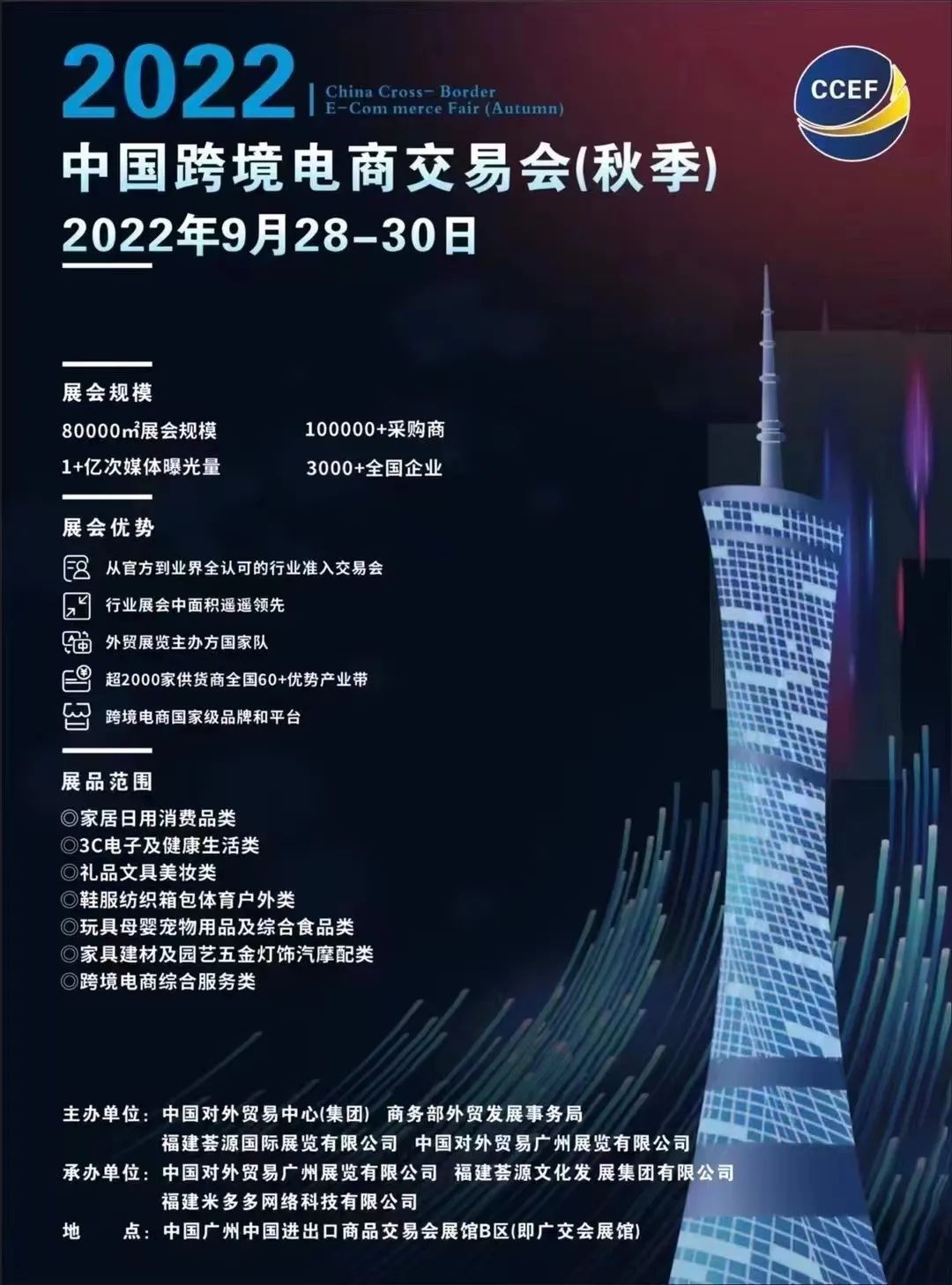 2022广州跨境电商交易会(秋季) 展会时间:2022年9月28-30日展会地点:广州市,中国进出口商品交易会展馆B区主办单位:中国对外贸易中心集团有限公司、商务部外贸发展事务局、中国对外贸易广州展览有限公司、福建荟源国际展览有限公司 展会简介:中国跨境电商交易会(秋季)是…