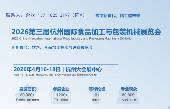2026第三届杭州国际食品加工与包装机械展览会2026 China (Hangzhou) International Food Industry and Packaging Machinery Exhibition同期展会:饮料、食品加工技术与设备展览会2026年4月16-18日 | 杭州大会展中心承办单位北京江恒博威国际展览有限公司 江恒博威(上海)会展…