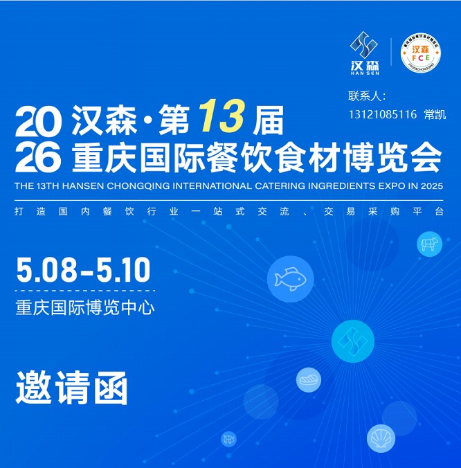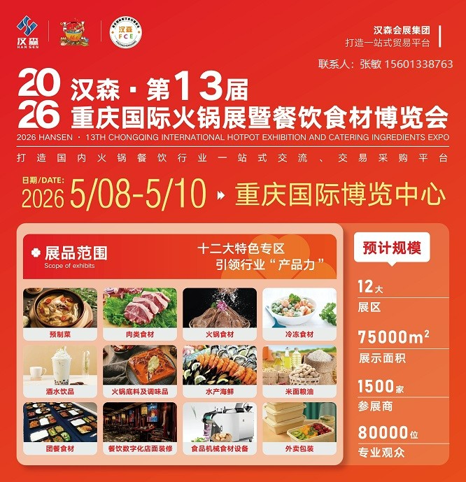 供应链创新/2026年第13届重庆餐饮食材展/火锅食材及用品展/预制菜产业博览会展会时间:2026年5月8日-5月10日展会场馆:重庆国际博览中心主办单位:北京汉森国际展览有限公司展会周期:一年一届展会地区:重庆 | 重庆市展会行业:食品|饮料|酒展会规模:1500家(预计)参展咨询:…