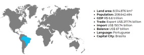 巴西经济自2015 年连续两年衰退后,从2017 年触底反弹,呈现恢复性增长。2017、2018 连续两年其GDP 增长超过1%。据巴西经济部门预测,2019 年巴西GDP 增长率将达到2%左右。2018 年中巴双边货物贸易额为 989.4 亿美元, 增长 32.2%。中国向巴西出口 347.3 亿美元, 增长27.1%,其中机电产品出口141.8亿美元,占总出口额的40.8%。2019年1-4 月中巴双边货物贸易额343.80 亿美元,同比增长16.34%。中国是巴西第一大出口目的地国和第一大进口来源国。