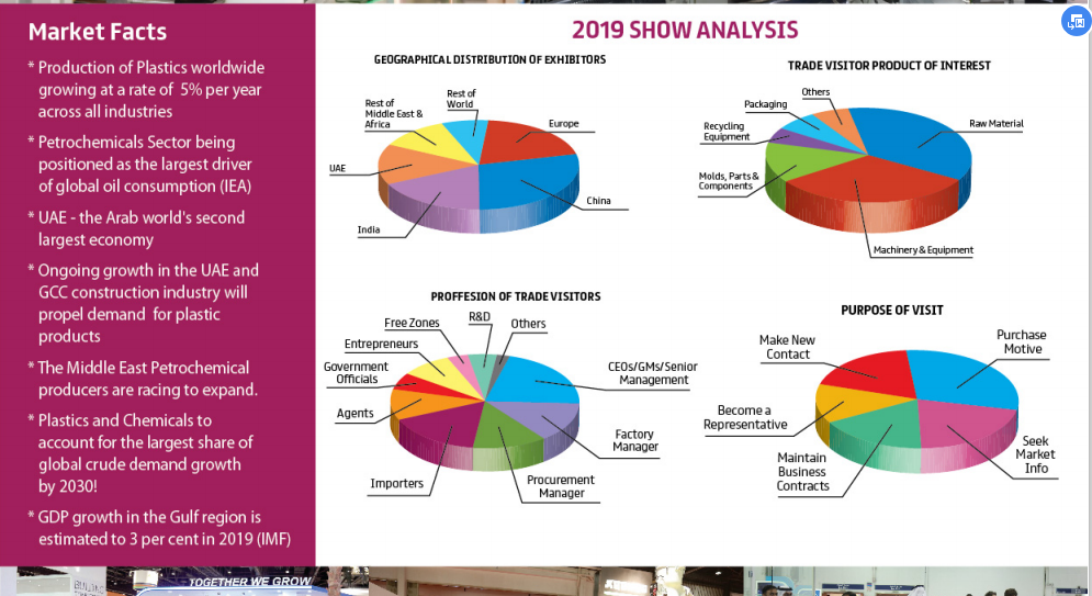 该展会是中东地区最大且最专业的塑料橡胶行业展,上届展会面积达31,068平米,吸引了来自32个国家的914家展商参与进来,组成了13个国际展区,展商来自奥地利,孟加拉国,比利时,加拿大,中国,丹麦,埃及,法国,德国,希腊,印度,印度尼西亚,伊朗,意大利,日本,约旦,韩国,沙特阿拉伯,科威特,黎巴嫩,荷兰,阿曼,巴基斯坦,西班牙,瑞士,泰国,土耳其,英国,美国等。展会吸引了来自海湾国家,欧洲,美洲,印度等108个国家和地区的15,228位专业买家。欧洲塑料和橡胶工业机械制造商协会,德国机械设备制造业联合会,全印橡胶工业协会,埃及出口商协会,意大利对外贸易委员会,台湾模具及模具工业协会,韩国塑料加工工业协会,奥地利联邦协会等团组也参与了此次盛会。品牌老展商BOROUGE, TASNEE, ASTRA POLYMERS, NATPET, MUNTAJAT, KAESER, EKIN MAKINA, BASF等均以特装展位进行展出。