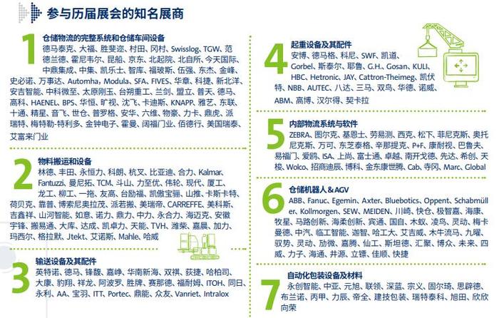 5、内部物流系统与软件:ZEBRA,图尔克、东芝泰格、P+F,康耐视、巴鲁夫、易福门、爱欧,ISA,上尚,富士通,卓越,南开戈德,先达,希创,天梭,Wolco,招商迪辰,博科等。