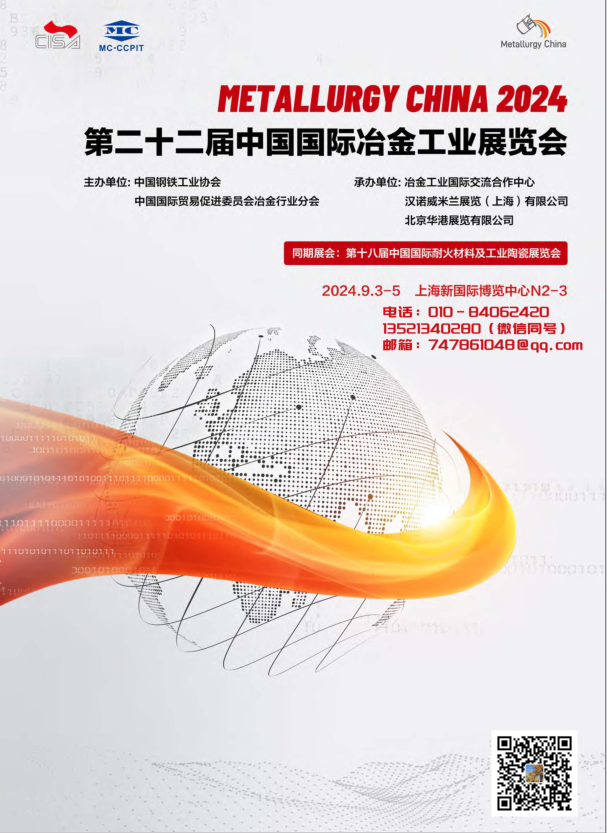 2024年第二十二届中国国际冶金工业展览会火热进行中2024上海冶金展、2024中国冶金展、2024中国冶金铸造展、2024中国冶金钢铁展、2024中国冶金加工设备展、2024钢铁加工设备展主题:智能制造、绿色发展 同期举办:第十八届中国国际耐火材料及工业陶瓷展览会2024年9月3–5日上海…