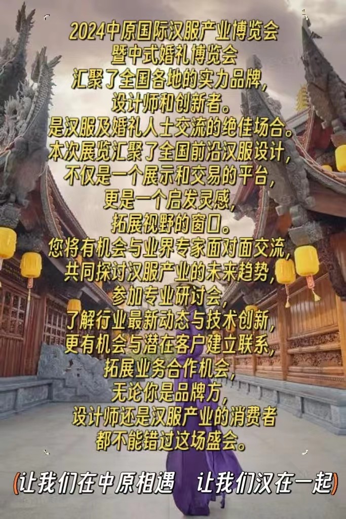 2024年9月我们相约中原 2024中原国际汉服产业暨中式婚礼博览会2024 Zhongyuan International Hanfu Industry and Chinese Wedding Expo 时间:2024年9月23-25日展览地点:郑州中原国际博览中心邀请函 拟邀单位:中国传统文化促进会/汉服专委会河南省服装行业协会汉服专委会洛阳…
