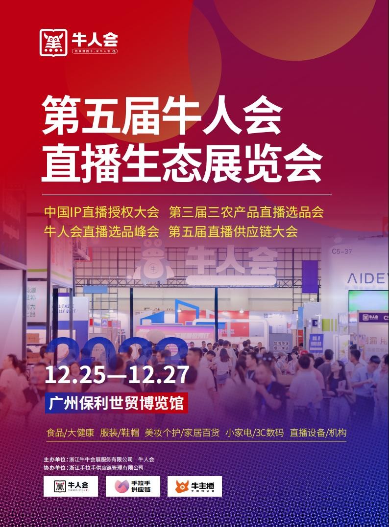 第五届牛人会直播生态展览会中国IP直播授权大会第三届三农产品直播选品会牛人会直播选品峰会第五届直播供应链大会 12.25—12.27广州保利世贸博览馆食品/大健康服装/鞋帽美妆个护/家居百货小家电/3C数码直播设备/机构 主办单位:浙江牛牛会展服务有限公司牛人会协办单位:浙江手…