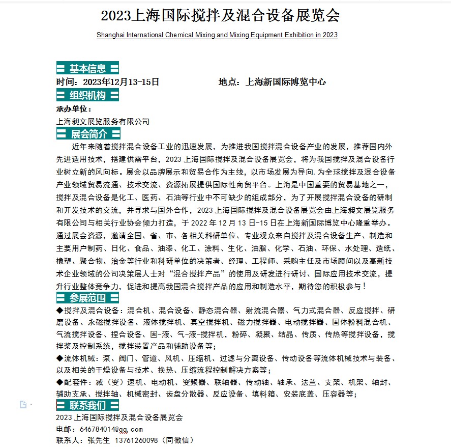 搅拌混合设备展|2023上海国际搅拌及混合设备展览会 2023上海国际搅拌及混合设备展览会Shanghai International Chemical Mixing and Mixing Equipment Exhibition in 2023〓 基本信息 〓时间:2023年12月13-15日 地点:上海新国际博览中心〓 组织机构 〓承办单位:…