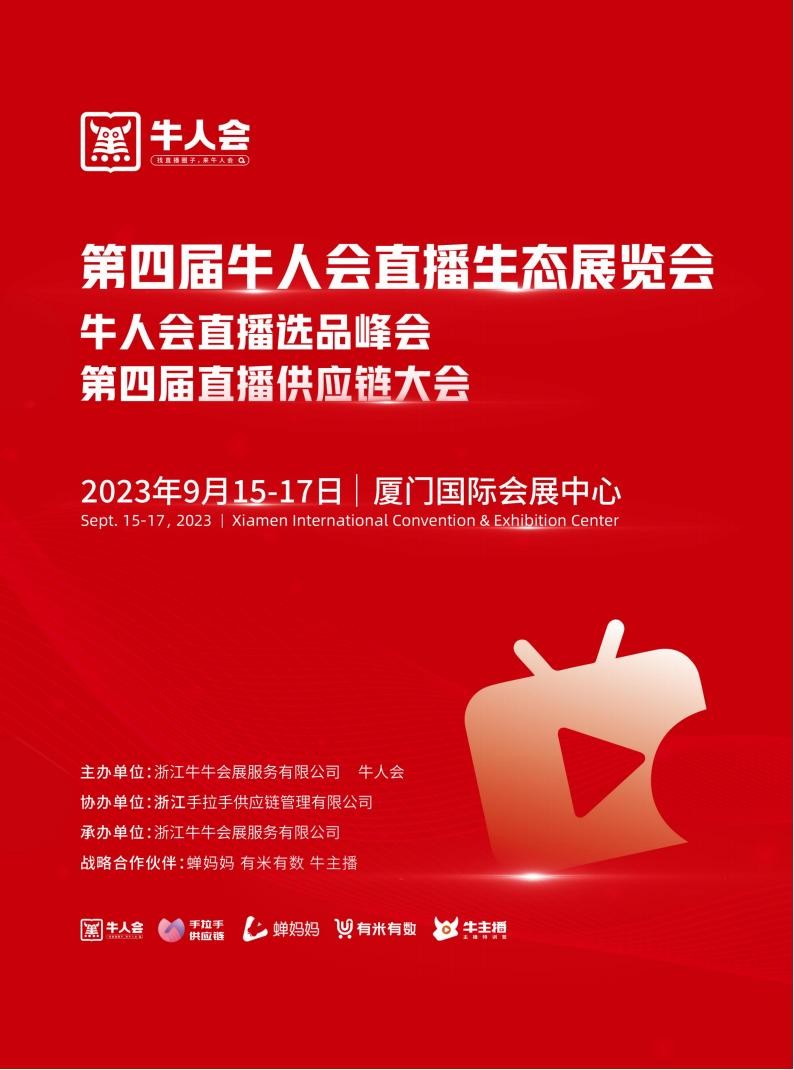2023第四届牛人会直播生态(义乌)展览会同期举办:牛人会直播选品峰会 第四届直播供应链大会时间:2023年9月15-17日 地点:厦门国际会展中心 主办单位:牛人会 浙江牛牛会展服务有限公司协办单位:浙江手拉手供应链管理有限公司承办单位:浙江牛牛…