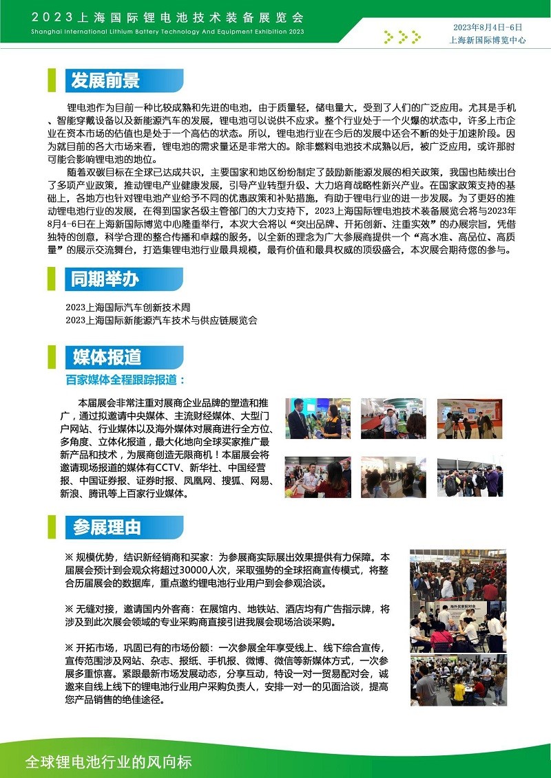 2023上海国际锂电池技术装备展会 | 新能源锂电池产业展会时 间:2023年8月4~6日 地 点:上海新国际博览中心同期举办:2023上海国际汽车创新技术周 2023上海国际新能源汽车技术与供应链展览会发展前景: 展品涵盖动力电池、储能电池、电芯、PACK、正负极材料、电解液、隔…