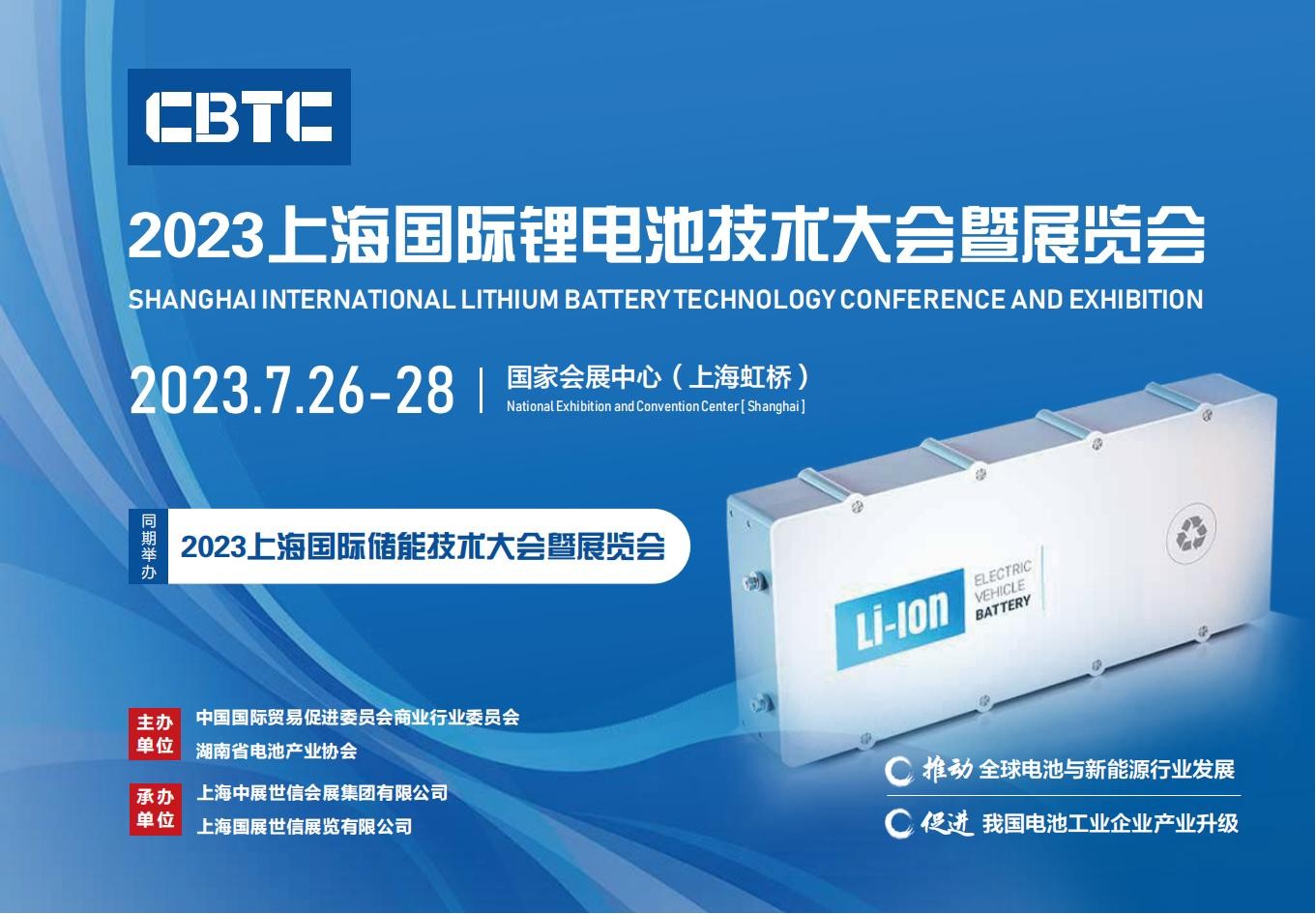 2023锂电池展|2023中国锂电池技术大会 CBTC2023中国锂电池技术大会暨展览会(一年一届)展会地点:中国.上海 虹桥国家会展中心主办机构:中国国际贸易促进委员会商业行业委员会湖南省电池行业协会赛迪工业和信息化研究院公投新能源发展有限公司上海中展世信会展集团有限公司展…