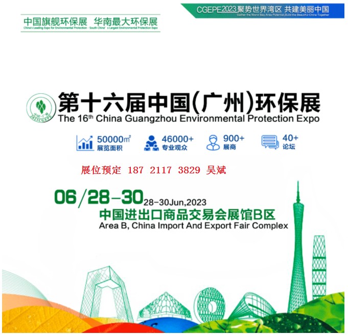 2023第十六届中国广州国际环保产业博览会The 16th China Guangzhou International Environmental Protection Industry Expo2023环境产业创新创业及技术交流大会2023年6月28-30日28-30Jun , 2023中国进出口商品交易会展馆China import And Export Fair Complex展位预定:吴经理…