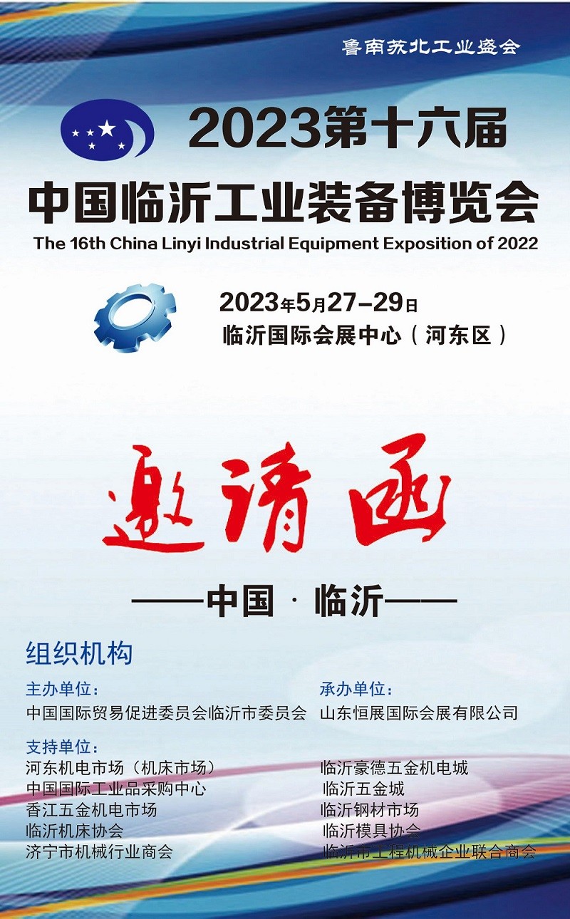 山东鲁南苏北装备盛会 总规模40000平方米2023第十六届临沂工业装备(机床)博览会时间:2023年5月27日-29日 地点:山东临沂国际会展中心 主办单位:中国国际贸易促进委员会临沂市委员会 承办单位: 山东恒展国际会展有限公司 协办单位:临沂市模…
