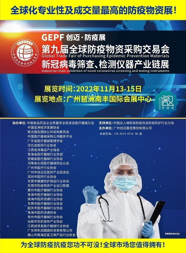 全球防疫物资采购交易会于2022年11月13-15日在广州琶洲南丰国际会展中心隆重召开! 参展咨询:15999987707 GEPF创迈防疫展第9届全球防疫物资采购交易会基本信息:时间:2022年11月13日-15日展馆:广州琶洲南丰国际会展中心地址:广州市海珠区新港东路阅江中路380号(邮编:510000…