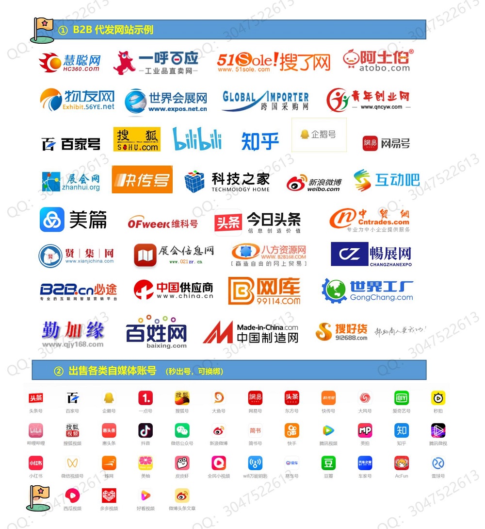 新浪黄V、搜狐号、网易号、百家号、新浪博客、搜狗号、凤凰号、今日头条、360问答、QQ看点、百度贴吧、百度知道、百姓网、大鱼号、东方头条、豆瓣、封面号、赶集网、和讯博客、快传、乐乎、列举网、企鹅号、趣头条、搜狗问问、搜狐博客、随意发、新浪博客、新浪看点、一点资讯、中金在线