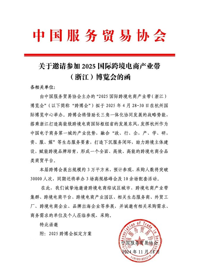 2025国际跨境电商产业带(浙江)博览会拟定方案一、展会名称2025国际跨境电商产业带(浙江)博览会(简称“跨博会”)二、组织机构主办单位:中国服务贸易协会承办单位:浙江跨博展览服务有限公司展务执行单位:SIE跨境平台虹桥国际中央商务区总部[百城万企(上海)会展会务有…